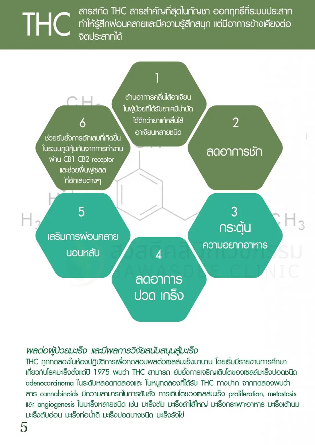 สารสกัด THC สารสำคัญที่สุดในกัญชา ออกฤทธิ์ที่ระบบประสาท ทำให้รู้สึกผ่อนคลายและมีความรู้สึกสนุก แต่มีอาการข้างเคียงต่อจิตประสาทได้