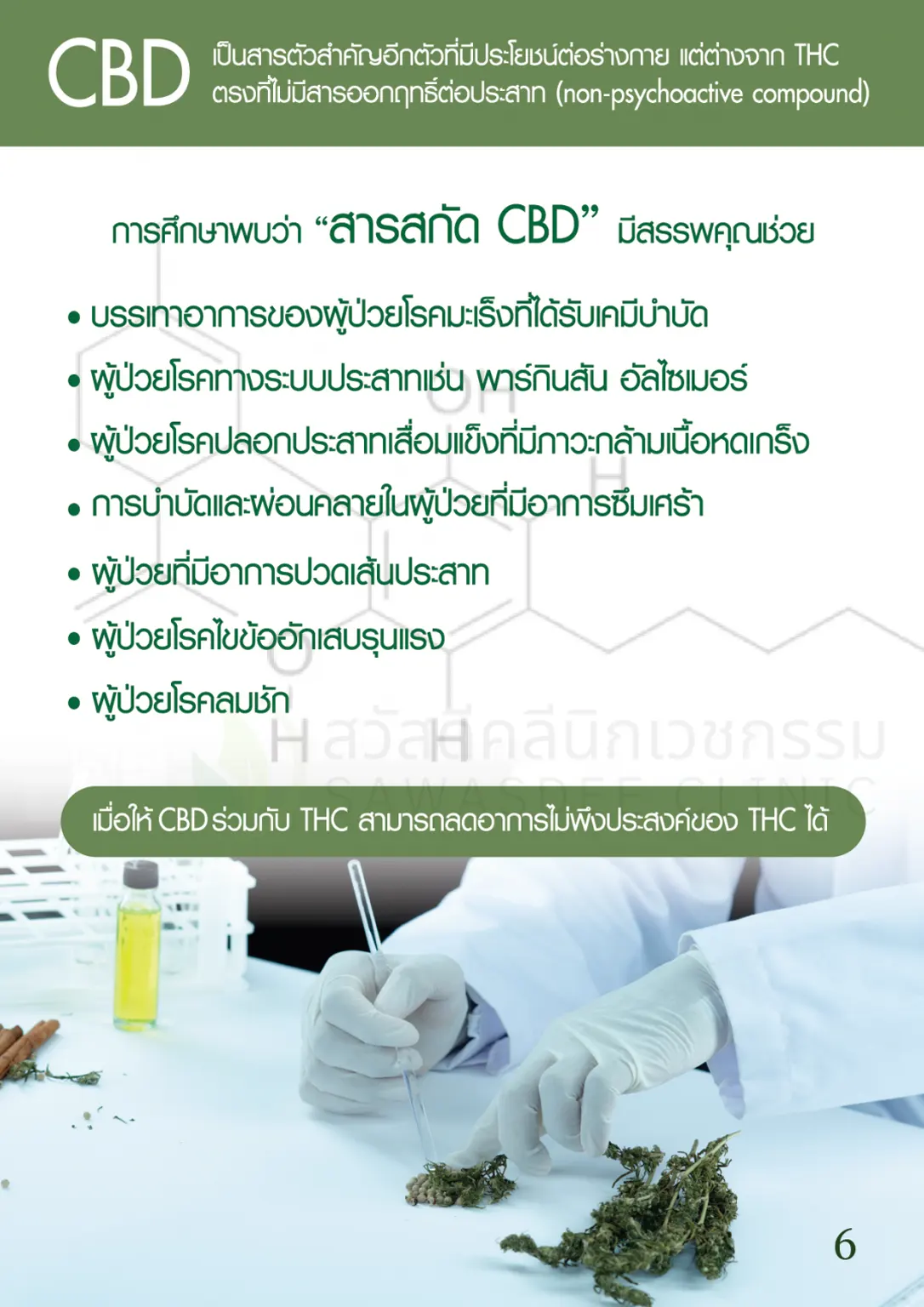 CBD เป็นสารจากกัญชาตัวสำคัญอีกตัวที่มีประโยชน์ต่อร่างกาย แต่ต่างจาก THC ตรงที่ไม่มีสารออกฤทธิ์ต่อประสาท (non-psychoactive compound)
